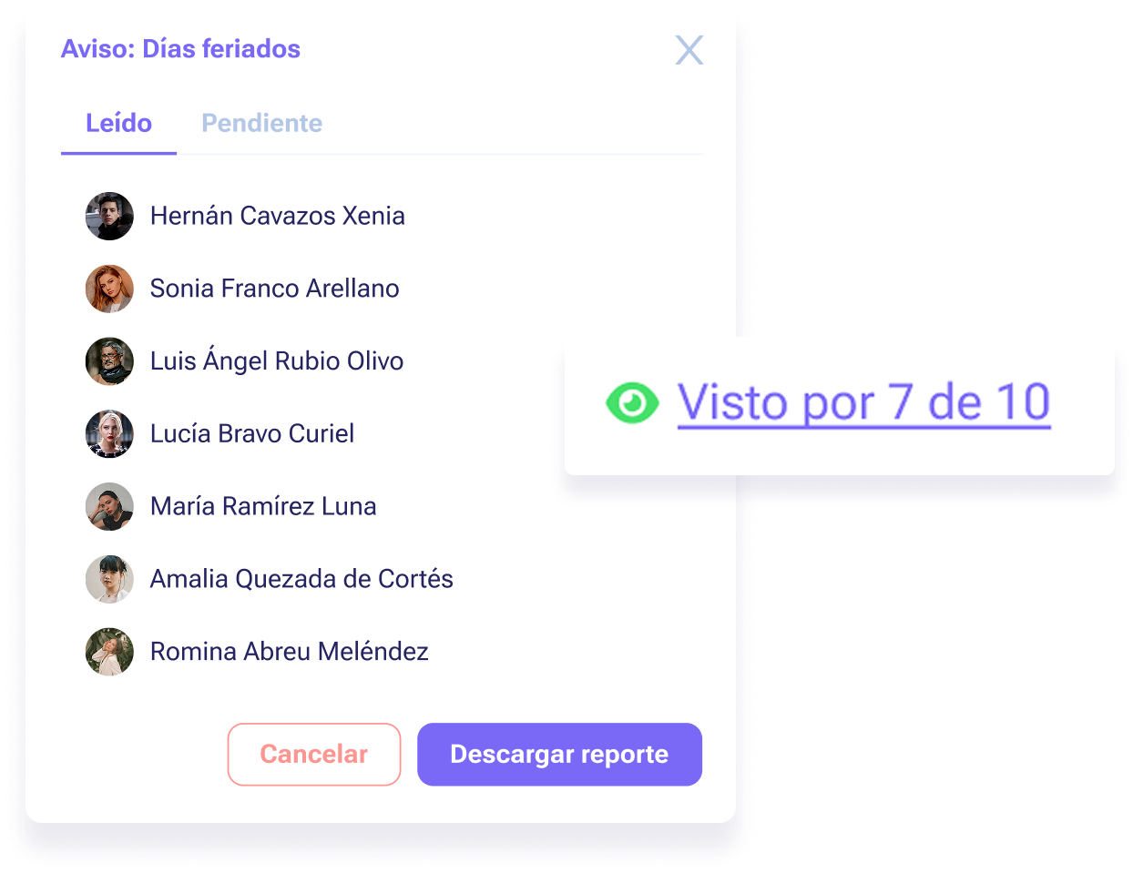 Genera y publica avisos importantes en cualquier momento para que todos los empleados los vean desde su portal. Comparte información clave de manera rápida y efectiva, asegurando que nadie se quede sin enterarse.