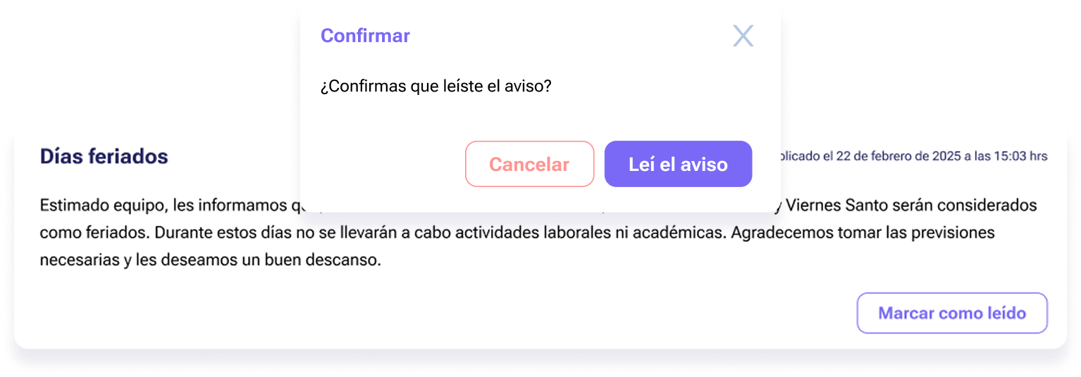 Cada empleado podrá visualizar los avisos importantes y marcarlos como leídos una vez revisados. Esta función ayuda a asegurar que la información ha sido recibida y facilita el seguimiento de los comunicados internos.