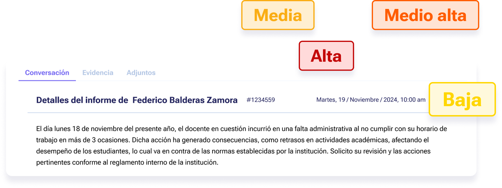 Crea informes precisos para tus empleados, definiendo su nivel de severidad y agregando evidencia o documentos adjuntos. Facilita el seguimiento y la gestión de cada caso con información clara y estructurada.