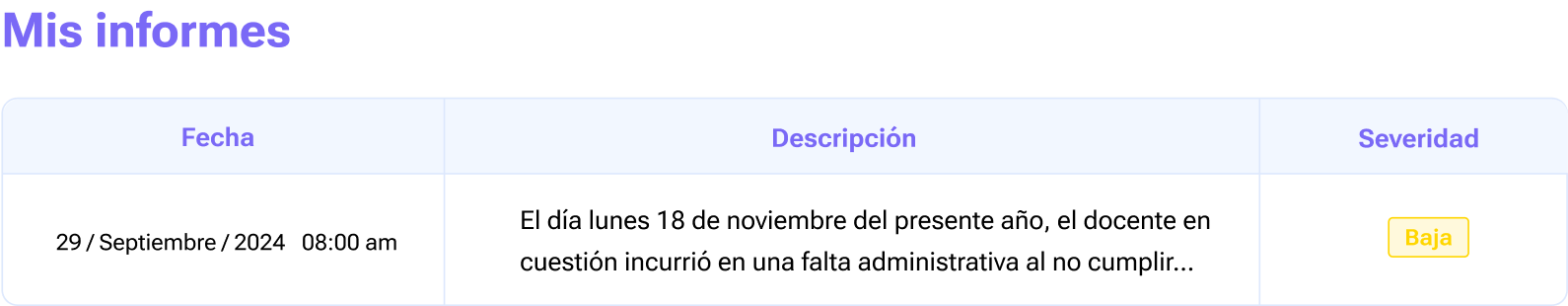 Cada empleado puede revisar sus informes, ver los comentarios de los administradores y acceder a la evidencia adjunta. Una herramienta que promueve la transparencia y facilita el seguimiento de cada caso.